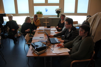 ![]() Puheenjohtaja ja sihteeri pöydän päässä. |